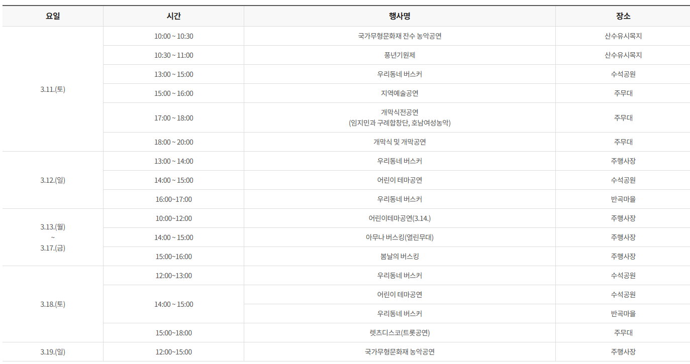 - 개막공연 : 3월 11일 토요일 18:20 ~ 20:00 축제장 주무대