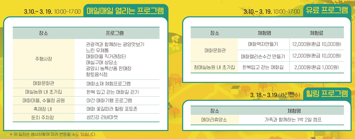 광양매화축제 3월 10일부터 3월 19일까지, 양산원동매화축제 3월 11일부터 3월 12일까지